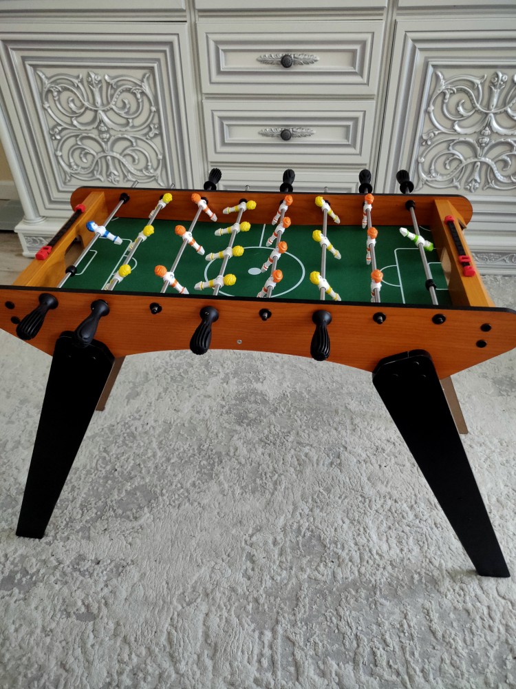 Этот футбольный стол очаровывает своим классическим дизайном и обещает часы увлекательного веселья для всей семьи. Игровое поле, словно уменьшенный стадион, выполнено в зеленых тонах, что создает полное ощущение настоящего матча. За удобными ручками – вся команда: вратарь, защитники, полузащитники и нападающие, готовые на всё ради победы. А чтобы следить за счетом, на столе предусмотрены специальные линейки.